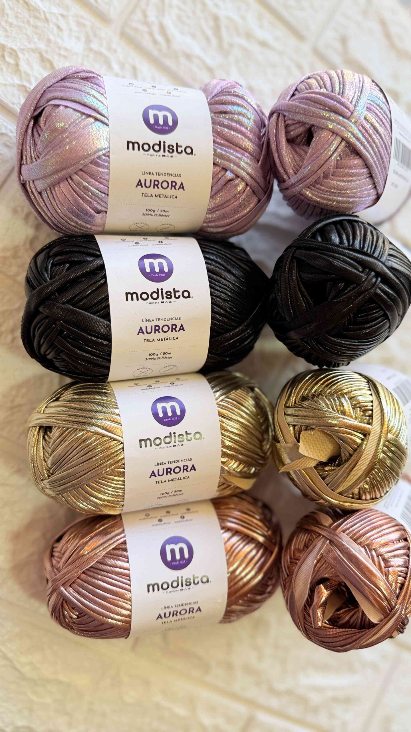 Aurora es una tela metalizada tipo trapillo de 1,8 mm de ancho, perfecta para quienes desean tejer con estilo y luminosidad. Con un acabado brillante que imita el look del metal, Aurora ofrece una textura suave, flexible y fácil de trabajar, ideal para usar con palillos de 6 mm o crochet de 6.5 mm.